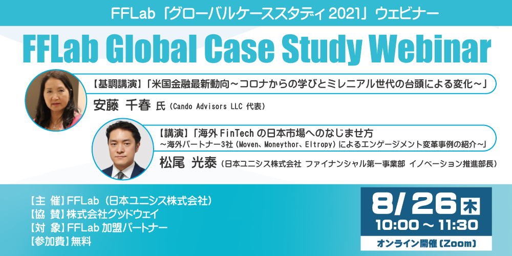 2021年8月26日(木)10:00~11:30、FFLab(Financial Foresight Lab)は、FFLab加盟パートナーに限定し、「米国金融最新動向、コロナからの学びとミレニアル世代の台頭による変化」をテーマとした基調講演や、「海外FinTechの日本市場へのなじませ方」における具体的な取り組みを紹介するウェビナー、 FFLab「グローバルケーススタディ」を開催します。
