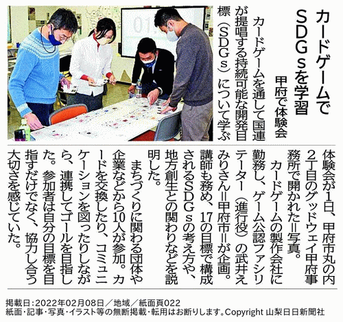【グッドウェイ】山梨日日新聞への掲載「カードゲームでSDGsを学習 甲府で体験会」(2022年2月8日 22面/地域 許諾済み)