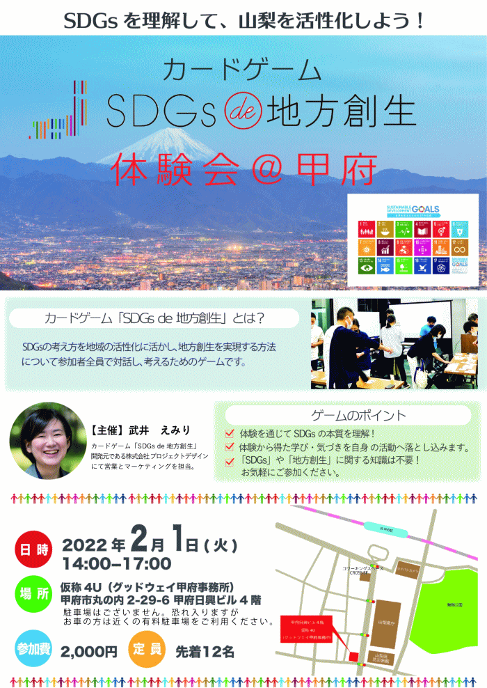 2022年2月1日(火)に、仮称4U(グッドウェイ甲府事務所:山梨県甲府市丸の内2-29-6 甲府日興ビル4F)で開催された『カードゲーム「SDGs de 地方創生」体験会@甲府』について、本件に関する記事が、山梨日日新聞(2022年2月8日 22面/地域)に掲載されたことをお知らせいたします。