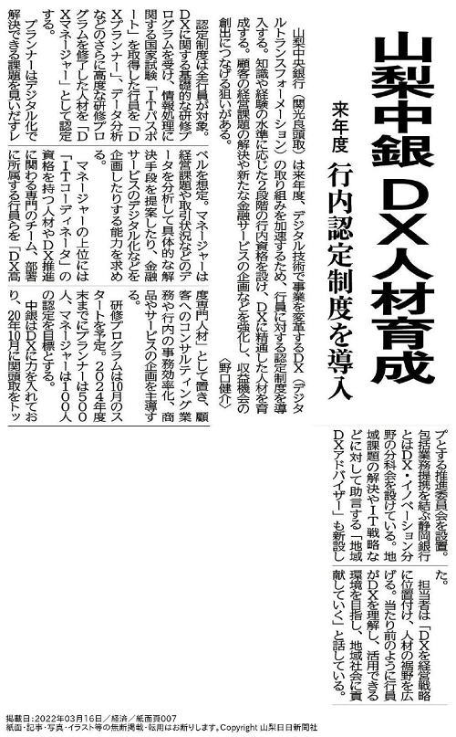 【グッドウェイ】山梨日日新聞への掲載「山梨中銀 DX人材育成 来年度 行内認定制度を導入」(2022年3月16日 7面/経済 許諾済み)