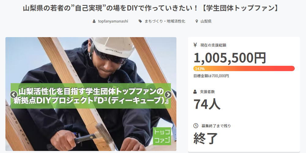 現在、学生団体トップファンは、クラウドファンディング『山梨県の若者の”自己実現”の場をDIYで作っていきたい!「D³(ディーキューブ)プロジェクト」』を通じて、新しい活動拠点となる「仮称4U」の改修をDIY(Do It Yourself)で実施中。募集開始約2週間で当初の目標金額 700,000円を達成し、最終的に 1,005,500円が集まりました。支援者は山梨への熱い想いを持つ社会人や学生の個人に加え、オリジナルスポンサー(法人)として、株式会社山梨中央銀行、BIPROGY株式会社(日本ユニシス株式会社)、株式会社ワイ・シー・シー、株式会社NAVICUS、株式会社グッドウェイの5社が支援。県内大学生と社会人/社会との接点を増やすことで、さらなるコラボレーション活動を展開してまいります。
