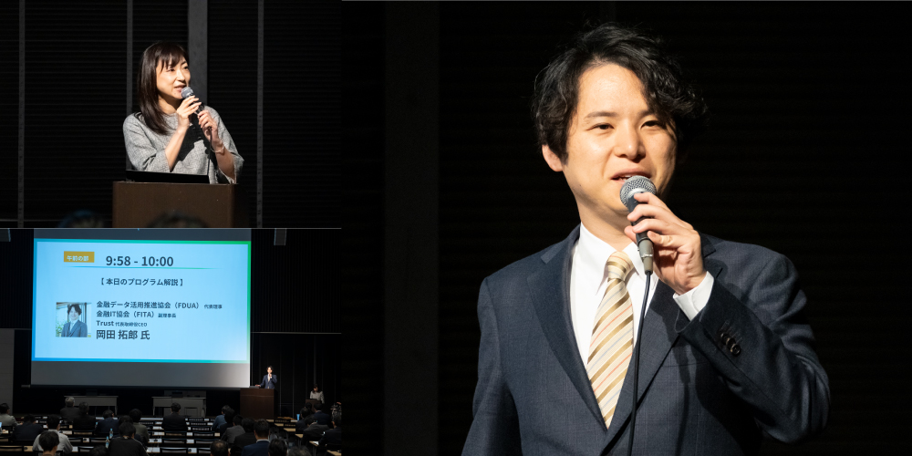 開幕の挨拶に立ったのは、岡田 拓郎 氏(金融データ活用推進協会(FDUA) 代表理事、金融IT協会(FITA) 副理事長、Trust 代表取締役CEO)。