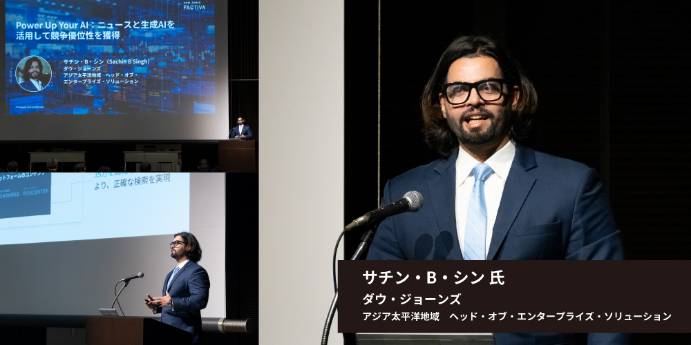 サチン・B・シン氏(ダウ・ジョーンズ アジア太平洋地域 エンタープライズソリューション責任者)は、「ニュースと生成AIの活用によるリスク予測とビジネス成長の可能性」と題して、同社が世界中のクライアントと共に実証してきたユースケースと仕組みを紹介した。