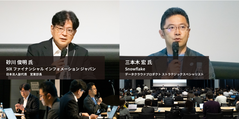 「金融機関のAI活用を支えるデータ基盤の革新力」と題し、砂川 俊明氏(SIXファイナンシャル インフォメーション ジャパン 日本法人副代表 営業部長)と、三本木 宏氏(Snowflake データクラウドプロダクト ストラテジックスペシャリスト)による対談講演が行われた。