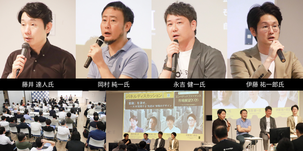 休憩後に行われたパネルディスカッションでは、「エンベデッドファイナンス市場展望2026」をテーマに、モデレーターの藤井 達人氏(みずほフィナンシャルグループ デジタル企画部 執行役員)の進行のもと、伊藤氏に加えて、岡村 純一氏(Shopify Japan Senior Partner Solutions Engineer)、永吉 健一氏(みんなの銀行 取締役頭取)が登壇し、エンベデッドファイナンスの現在と未来について活発な議論が展開された。 永吉氏は、みんなの銀行がBaaSに特化した設計思想で構築されたデジタルバンクであることを説明。「銀行の強みであるライセンスホルダーとしての機能を最大限発揮できるよう、マイクロサービス化してAPIで提供する」という戦略を明らかにした。また、AI活用については「使わない企業は生き残れない」と断言し、業務効率化だけでなくクリエイティビティの向上にも活用していることを強調した。岡村氏は、ShopifyがAIに100%コミットしていることを紹介。「UX担当」という肩書きを廃止し、全社員がUXを考える体制に移行したことや、「Shopify Catalog」という新機能でAIが商品を発見しやすいインターフェースを構築していることを説明。さらに、USDCステーブルコインの導入背景について、「コマースの民主化」というミッションのもと、暗号通貨に眠る流通の可能性を引き出す狙いがあることを明かした。