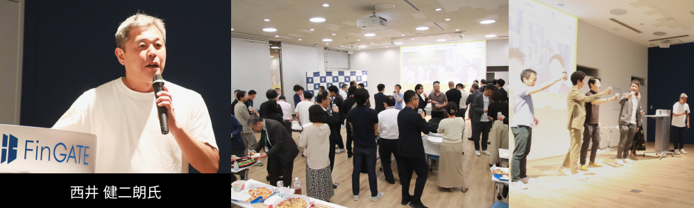 最後に水津氏より「Lets Enjoy Fintech!」の掛け声とともに、オンライン参加者向けのプログラム終了が宣言され、会場参加者はネットワーキングへと移行した。 プログラム終了後、会場後方でネットワーキングが実施され、西井 健二朗氏(セブン銀行 常務執行役員、Fintech協会 理事)の乾杯の音頭で交流がスタート。登壇者と参加者が軽食とドリンクが提供される中、参加者同士での活発な意見交換が行われた。特に、ステーブルコインの具体的な活用アイデアやBaaSビジネスの可能性について、実務者レベルでの深い議論が交わされた。